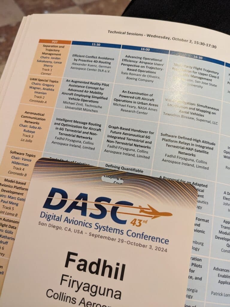 - Chih-Kuang Lin, Fadhil Firyaguna, Hamada Alshaer, Philip Harris, “Intelligent Message Routing and Optimization for Aircraft in 6G Terrestrial and Non-Terrestrial Networks” – DASC 2024, October 2024. (Best of Session Award)
